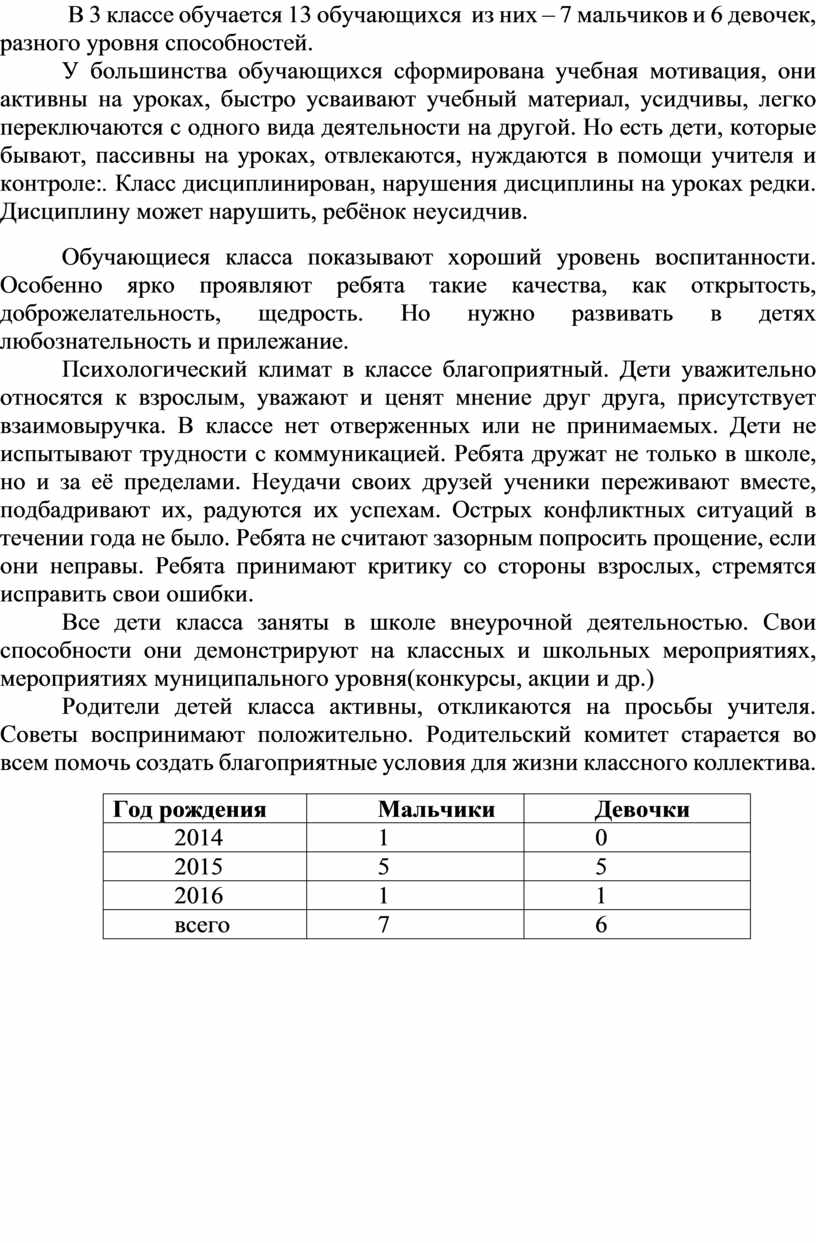В 3 классе обучается 13 обучающихся из них – 7 мальчиков и 6 девочек, разного уровня способностей.