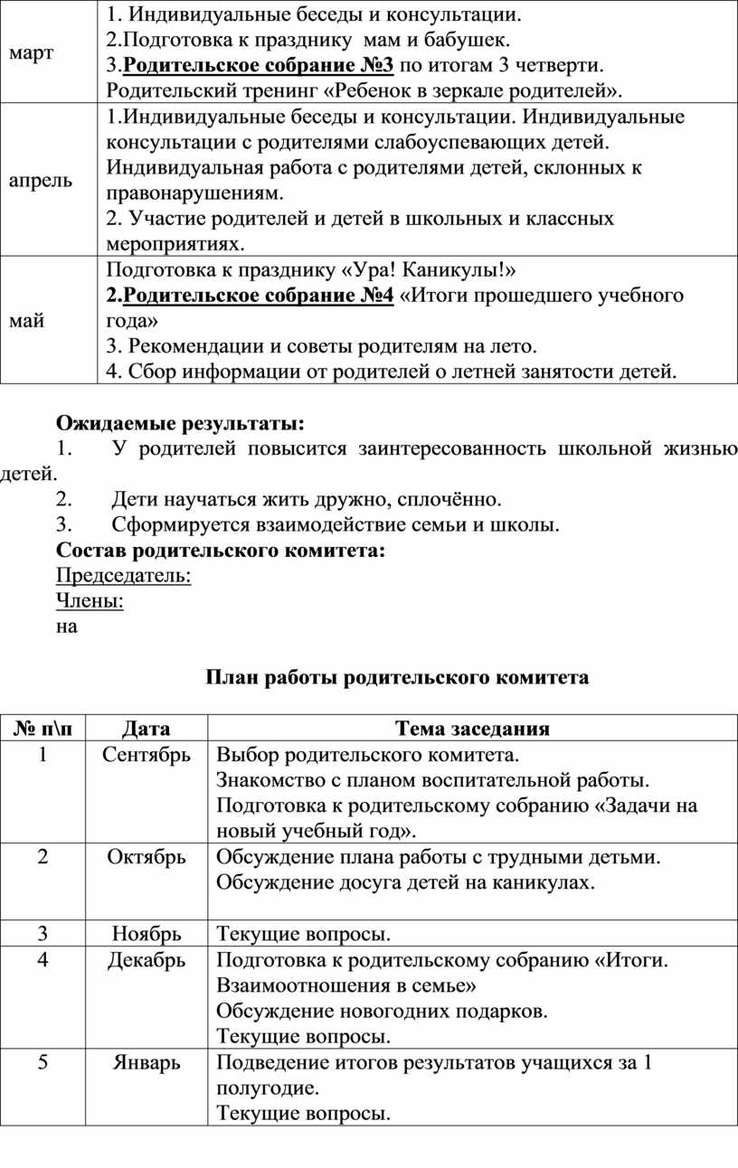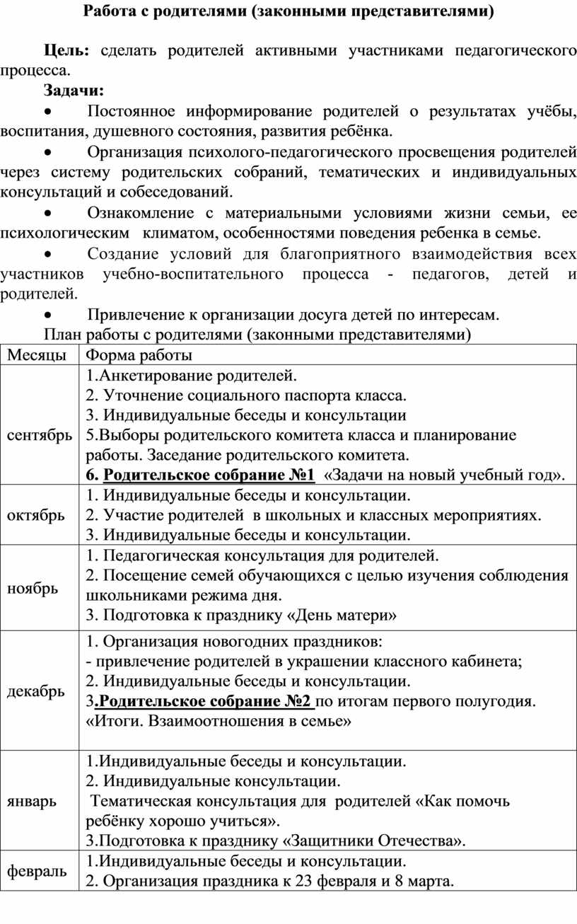 · привлечение учителей к участию в родительских собраниях класса для объединения усилий в деле обучения и воспитания детей.