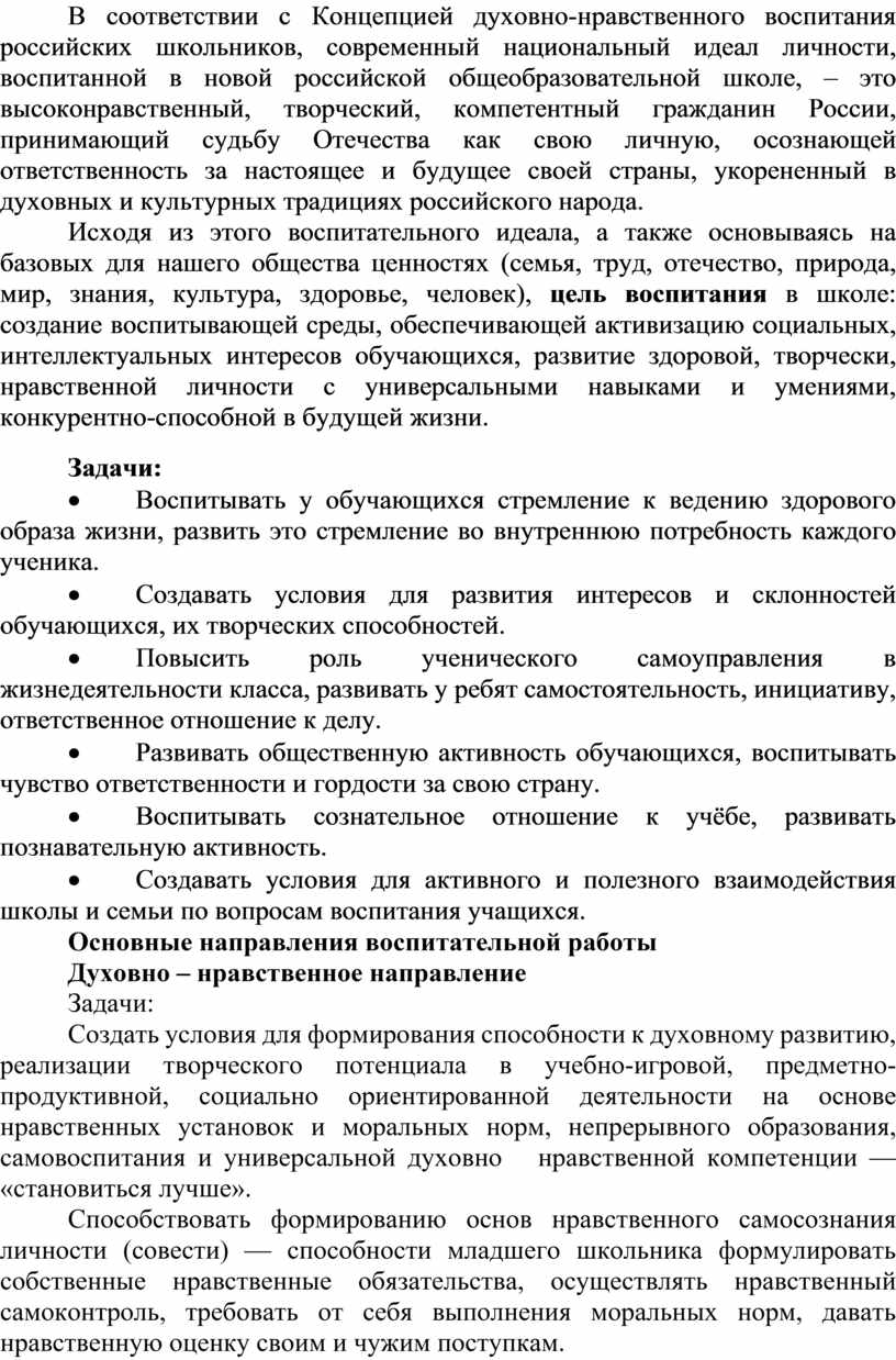 В соответствии с Концепцией духовно-нравственного воспитания российских школьников, современный национальный идеал личности, воспитанной в новой российской общеобразовательной школе, – это высоконравственный, творческий, компетентный гражданин России, принимающий судьбу Отечества как свою личную, осознающей ответственность за настоящее и будущее своей страны, укорененный в духовных и культурных традициях российского народа.