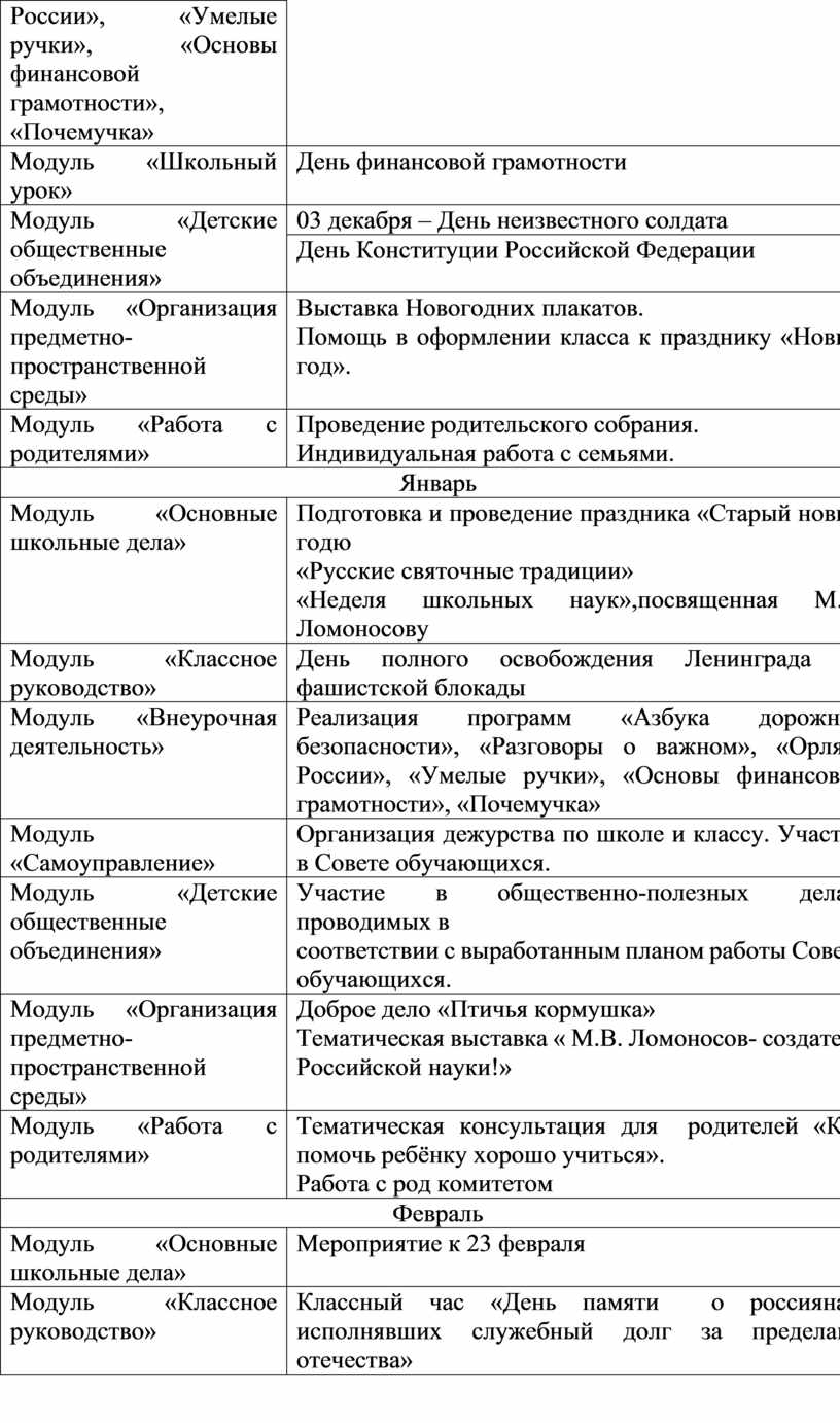 Реализация программ «Азбука дорожной безопасности», «Разговоры о важном», «Орлята России», «Умелые ручки», «Основы финансовой грамотности», «Почемучка» |