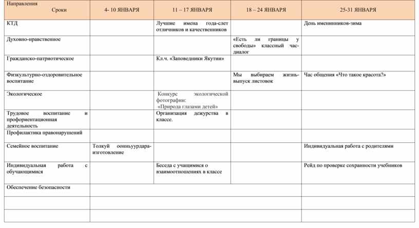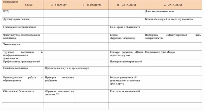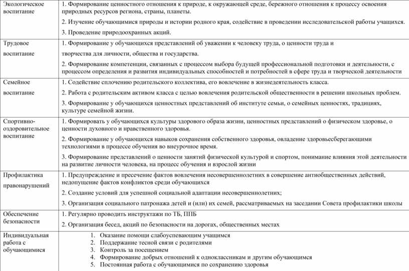 1. Оказание помощи слабоуспевающим учащимся 2. Поддержание тесной связи с родителями 3. Контроль за посещением 4. Формирование добрых отношений к одноклассникам и другим обучающимся 5. Постоянная работа с обучающимися по сохранению здоровья |