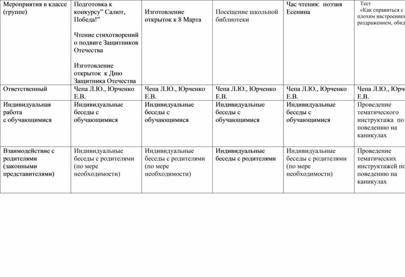 1. Восп. час.-«Помнит сердце, не забудет никогда» 2.Б «Пионеры -герои» 3. Час общ.: «Учимся честно говорить о поступке” 4.Б. « Что значит быть патриотом сегодня»