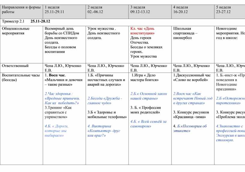 1.Б «День славянской письменности» 2.Б.”Уроки совести” 3.Игра- путешествие: “Как прекрасен этот мир! Посмотри!” 4.Час общ. «Портрет моего класса» |