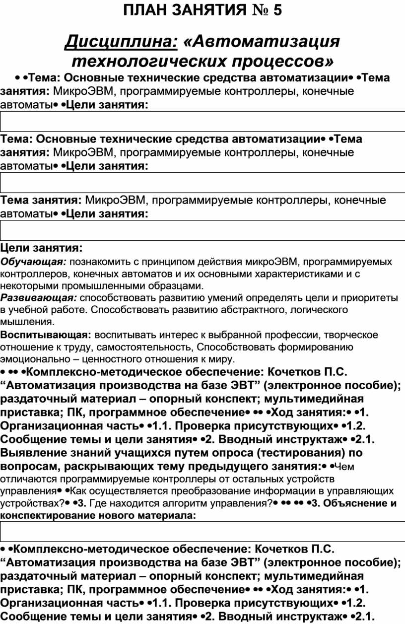 6. Задание на дом: раздаточный материал на основе электронного издания Кочеткова П.С. “Автоматизация производства на базе ЭВТ”; опорный конспект |