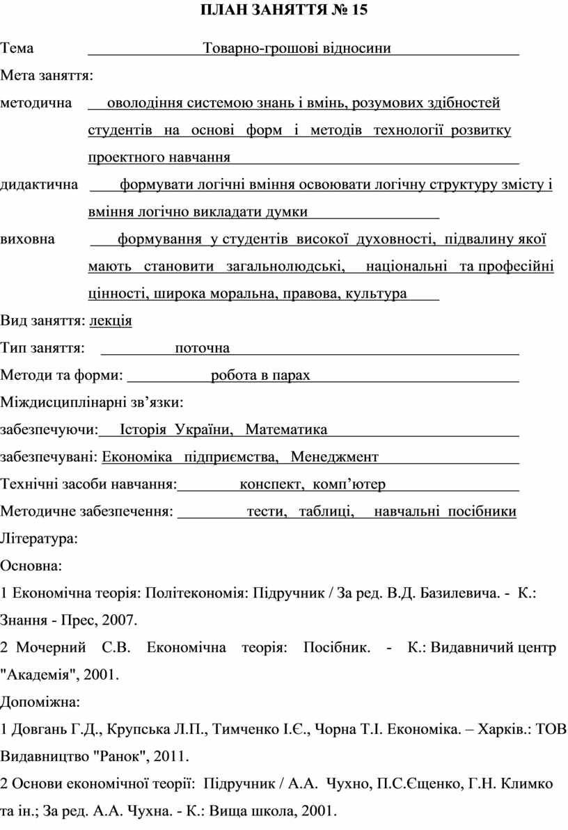 2.3 Мета (сформувати знання про натуральне й товарне виробництво; визначити з’ясувати особливості товари та його основні характеристики; визначити функції закону вартості; дослідження; сприяти розвитку інтересу студентів до економічної науки).