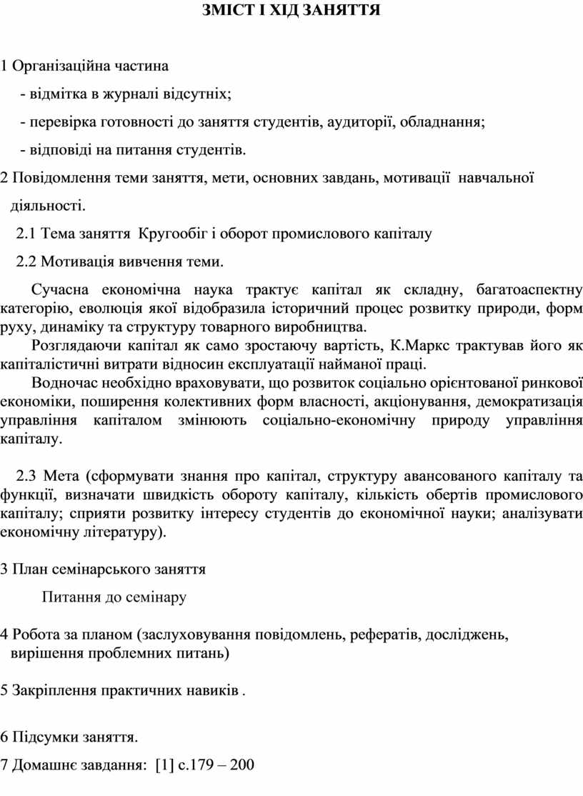 2.3 Мета (сформувати знання про капітал, структуру авансованого капіталу та функції, визначати швидкість обороту капіталу, кількість обертів промислового капіталу; сприяти розвитку інтересу студентів до економічної науки; аналізувати економічну літературу).