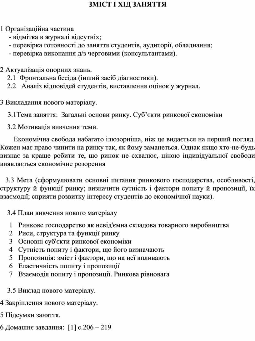 3.3 Мета (сформулювати основні питання ринкового господарства, особливості, структуру й функції ринку; визначити сутність і фактори попиту й пропозиції, їх взаємодії; сприяти розвитку інтересу студентів до економічної науки).