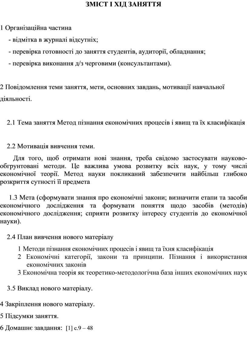 1.3 Мета (сформувати знання про економічні закони; визначити етапи та засоби економічного дослідження та формувати поняття щодо засобів (методів) економічного дослідження; сприяти розвитку інтересу студентів до економічної науки).