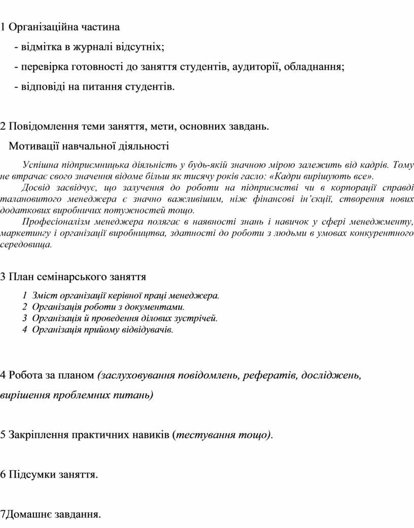 - перевірка готовності до заняття студентів, аудиторії, обладнання;