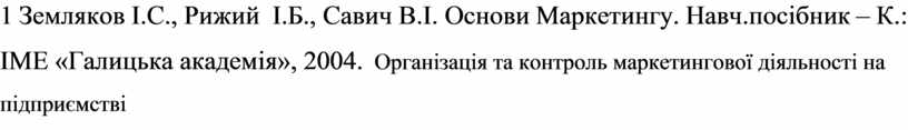 1 Земляков І.С., Рижий І.Б., Савич В.І. Основи Маркетингу. Навч.посібник – К.: ІМЕ «Галицька академія», 2004. Організація та контроль маркетингової діяльності на підприємстві
