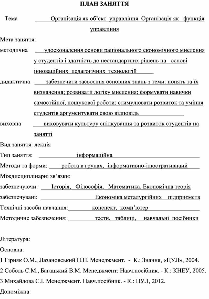 1 Гірняк О.М., Лазановський П.П. Менеджмент. - К.: Знання, «ЦУЛ», 2004.