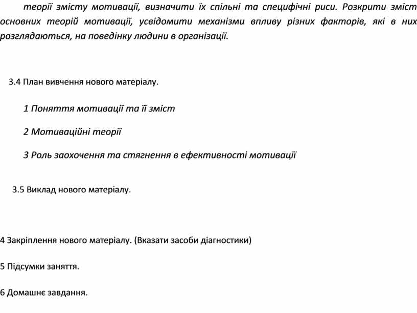 Усвідомити сутність категорії «мотивація». З’ясувати логіку процесу мотивації і взаємозв’язків між ключовими етапами в моделі мотивації. Засвоїти основні положення теорії змісту мотивації, визначити їх спільні та специфічні риси. Розкрити зміст основних теорій мотивації, усвідомити механізми впливу різних факторів, які в них розглядаються, на поведінку людини в організації.