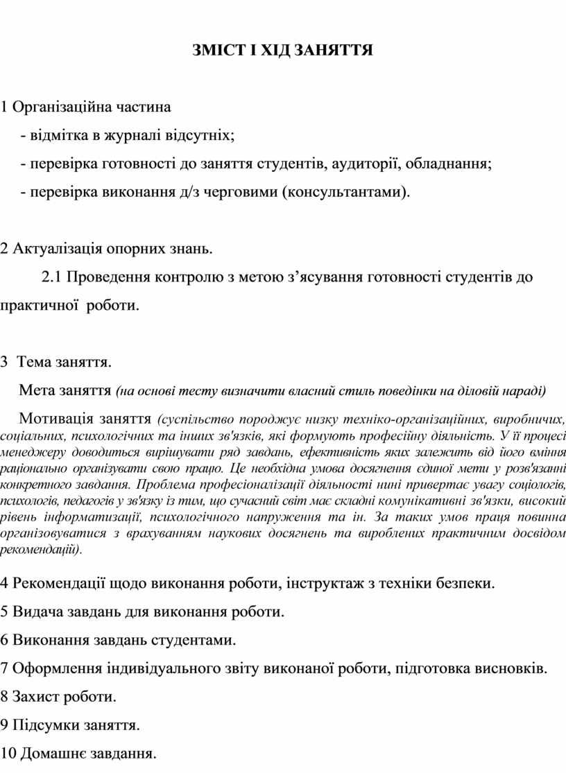 Мотивація заняття (суспільство породжує низку техніко-організаційних, виробничих, соціальних, психологічних та інших зв'язків, які формують професійну діяльність. У її процесі менеджеру доводиться вирішувати ряд завдань, ефективність яких залежить від його вміння раціонально організувати свою працю. Це необхідна умова досягнення єдиної мети у розв'язанні конкретного завдання. Проблема професіоналізації діяльності нині привертає увагу соціологів, психологів, педагогів у зв'язку із тим, що сучасний світ має складні комунікативні зв'язки, високий рівень інформатизації, психологічного напруження та ін. За таких умов праця повинна організовуватися з врахуванням наукових досягнень та вироблених практичним досвідом рекомендацій).