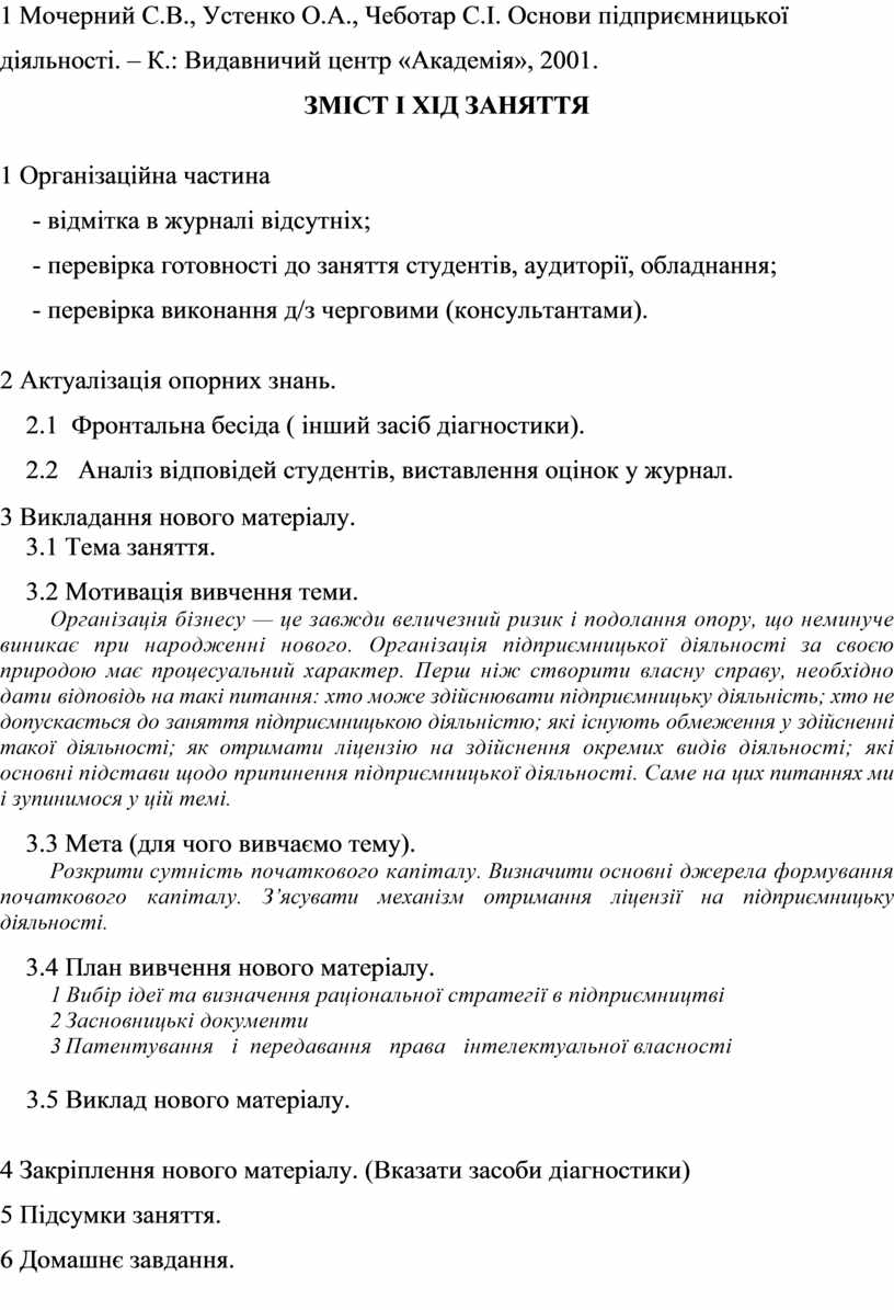1 Мочерний С.В., Устенко О.А., Чеботар С.І. Основи підприємницької діяльності. – К.: Видавничий центр «Академія», 2001.