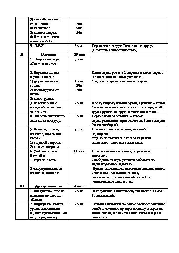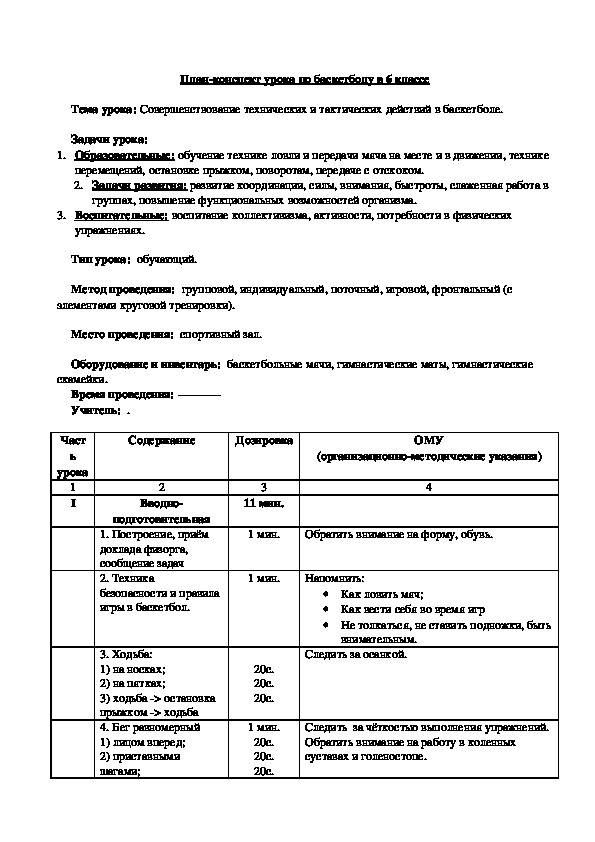 Время проведения: -----------1. Образовательные: обучение технике ловли и передачи мяча на месте и в движении, технике перемещений, остановке прыжком, поворотам, передаче с отскоком.