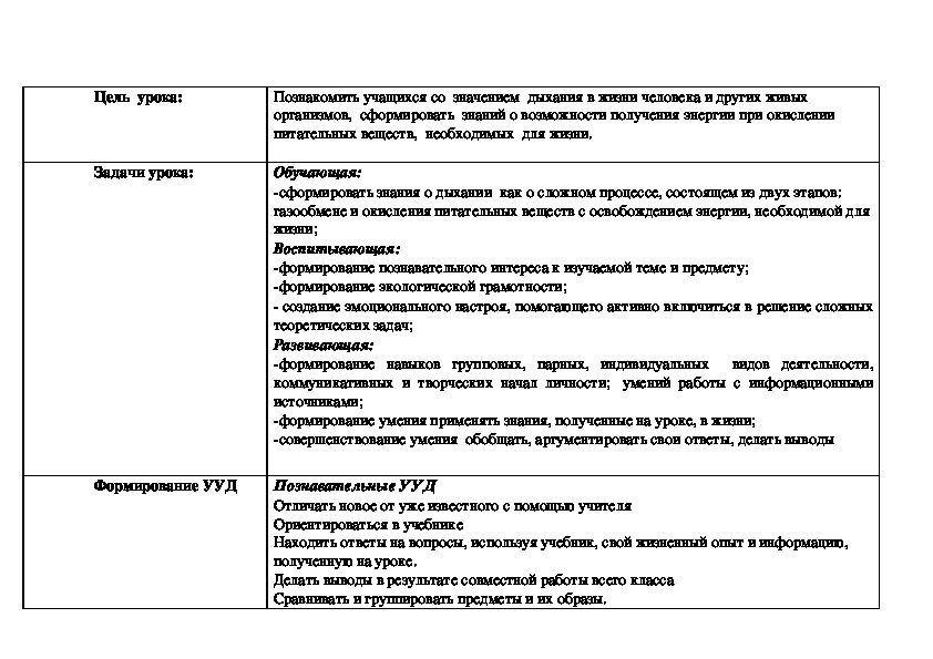 -сформировать знания о дыхании как о сложном процессе, состоящем из двух этапов: газообмене и окисления питательных веществ с освобождением энергии, необходимой для жизни;