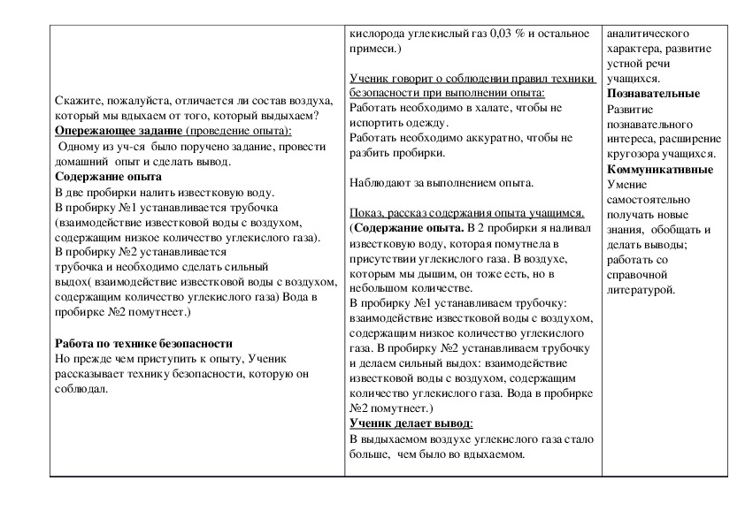 количеству групп), известковая вода, две пробирки, стеклянная трубочка,Содержание педагогического взаимодействия