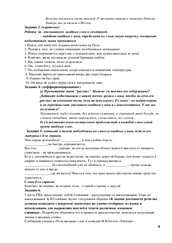 Задание 5: вставьте в текст подходящие по смыслу вводные слова, используя
