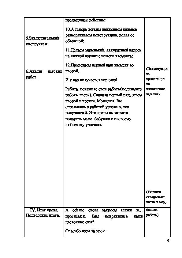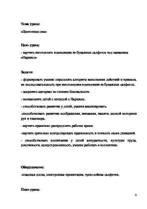 - способствовать воспитанию у детей аккуратности, культуры труда, усидчивости, целеустремленность, умение работать в коллективе.План - конспект урока "Цветочные сны"