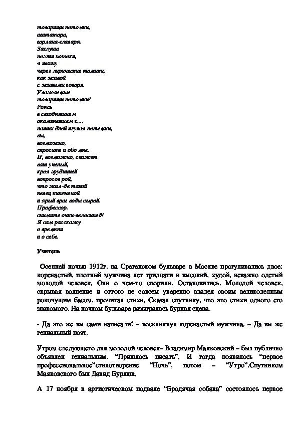Оргмомент. Звучит отрывок (в записи) из поэмы В.Маяковского “Во весь голос”