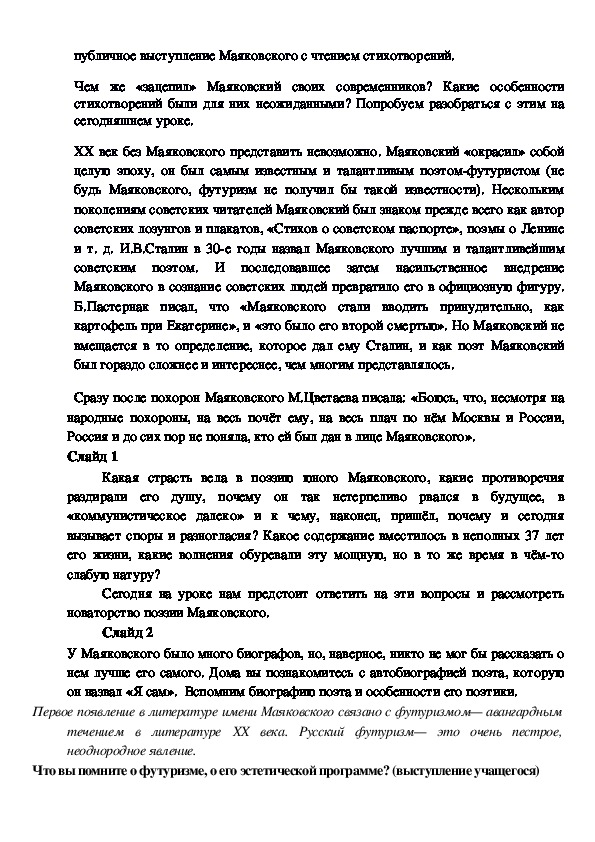 Цели: Организовать деятельность по анализу лирического произведения с точки зрения содержания и формы, по рассмотрению вопроса новаторства поэзии Маяковского, по развитию навыка связной речи и выразительного чтения; способствовать закреплению знаний теории литературы; содействовать в воспитании интереса к изучению поэзии МаяковскогоПлан-конспект урока "Я хочу будущего сегодня" 11 класс