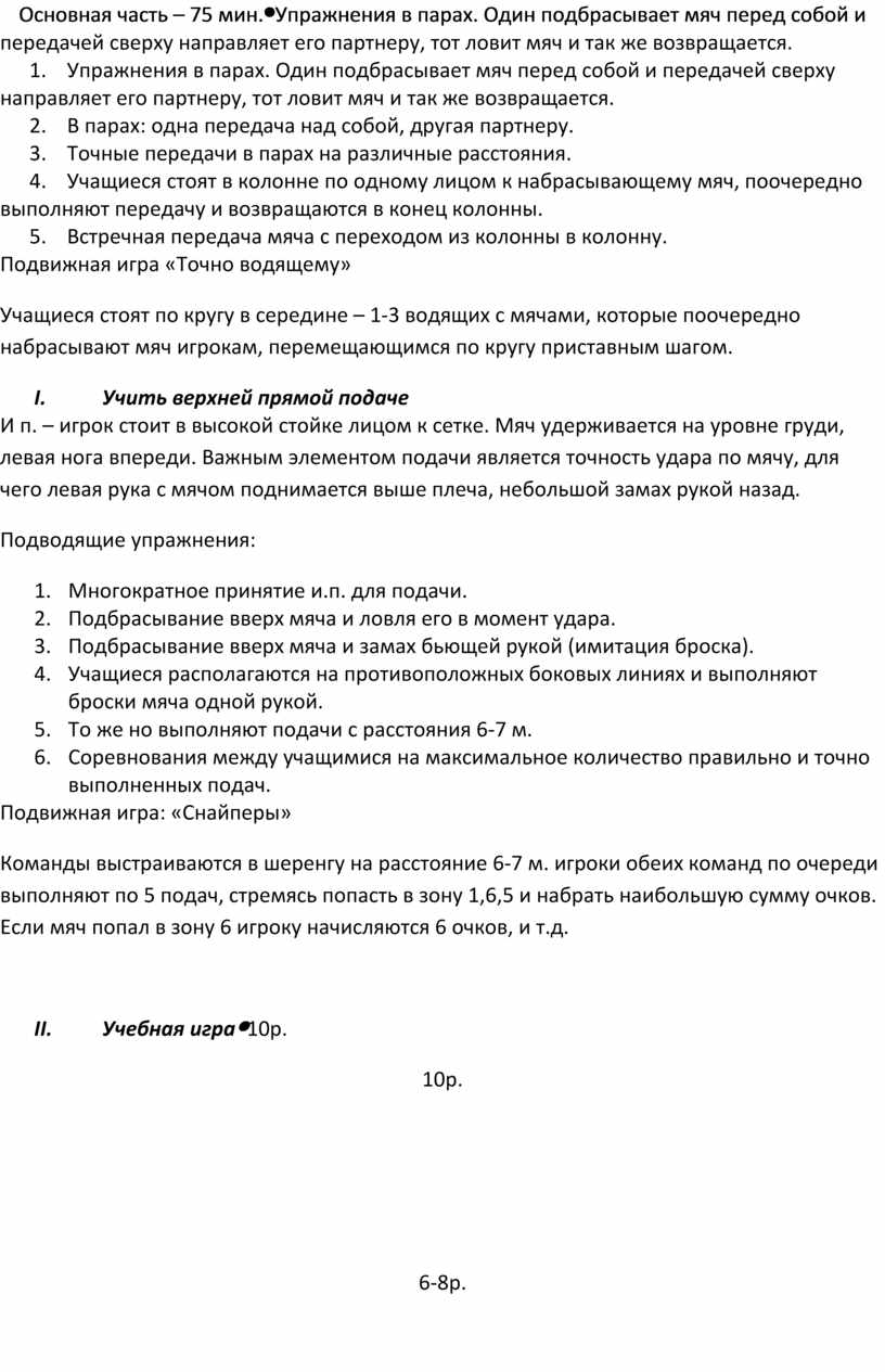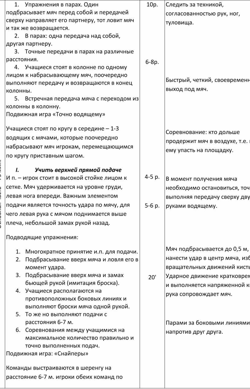 2. Упражнения в парах. Один подбрасывает мяч перед собой и передачей сверху направляет его партнеру, тот ловит мяч и так же возвращается. 3. В парах: одна передача над собой, другая партнеру. 4. Точные передачи в парах на различные расстояния. 5. Учащиеся стоят в колонне по одному лицом к набрасывающему мяч, поочередно выполняют передачу и возвращаются в конец колонны. 6. Встречная передача мяча с переходом из колонны в колонну. Подвижная игра «Точно водящему» Учащиеся стоят по кругу в середине – 1-3 водящих с мячами, которые поочередно набрасывают мяч игрокам, перемещающимся по кругу приставным шагом. II. Учить верхней прямой подаче И п. – игрок стоит в высокой стойке лицом к сетке. Мяч удерживается на уровне груди, левая нога впереди. Важным элементом подачи является точность удара по мячу, для чего левая рука с мячом поднимается выше плеча, небольшой замах рукой назад. Подводящие упражнения: 1. Многократное принятие и.п. для подачи. 2. Подбрасывание вверх мяча и ловля его в момент удара. 3. Подбрасывание вверх мяча и замах бьющей рукой (имитация броска). 4. Учащиеся располагаются на противоположных боковых линиях и выполняют броски мяча одной рукой. 5. То же но выполняют подачи с расстояния 6-7 м. 6. Соревнования между учащимися на максимальное количество правильно и точно выполненных подач. Подвижная игра: «Снайперы» Команды выстраиваются в шеренгу на расстояние 6-7 м. игроки обеих команд по очереди выполняют по 5 подач, стремясь попасть в зону 1,6,5 и набрать наибольшую сумму очков. Если мяч попал в зону 6 игроку начисляются 6 очков, и т.д.