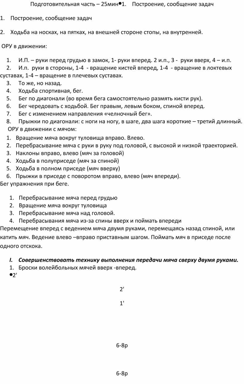 1. Построение, сообщение задач 2. Ходьба на носках, на пятках, на внешней стороне стопы, на внутренней. ОРУ в движении: 1. И.П. – руки перед грудью в замок, 1- руки вперед. 2 и.п., 3 - руки вверх, 4 – и.п. 2. И.п. руки в стороны, 1-4 - вращение кистей вперед, 1-4 - вращение в локтевых суставах, 1-4 – вращение в плечевых суставах. 3. То же, но назад. 4. Ходьба спортивная, бег. 5. Бег по диагонали (во время бега самостоятельно размять кисти рук). 6. Бег чередовать с ходьбой. Бег правым, левым боком, спиной вперед. 7. Бег с изменением направления «челночный бег». 8. Прыжки по диагонали: с ноги на ногу, в шаге, два шага короткие – третий длинный. ОРУ в движении с мячом: 1. Вращение мяча вокруг туловища вправо. Влево. 2. Перебрасывание мяча с руки в руку под головой, с высокой и низкой траекторией. 3. Наклоны вправо, влево (мяч за головой) 4. Ходьба в полуприседе (мяч за спиной) 5. Ходьба в полном приседе (мяч вверху) 6. Прыжки в приседе с поворотом вправо, влево (мяч впереди). Бег упражнения при беге. 1. Перебрасывание мяча перед грудью 2. Вращение мяча вокруг туловища 3. Перебрасывание мяча над головой. 4. Перебрасывания мяча из-за спины вверх и поймать впереди Перемещение вперед с ведением мяча двумя руками, перемещаясь назад спиной, или катить мяч. Ведение влево –вправо приставным шагом. Поймать мяч в приседе после одного отскока. I. Совершенствовать технику выполнения передачи мяча сверху двумя руками. 1. Броски волейбольных мячей вверх -вперед.