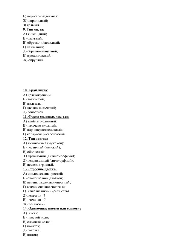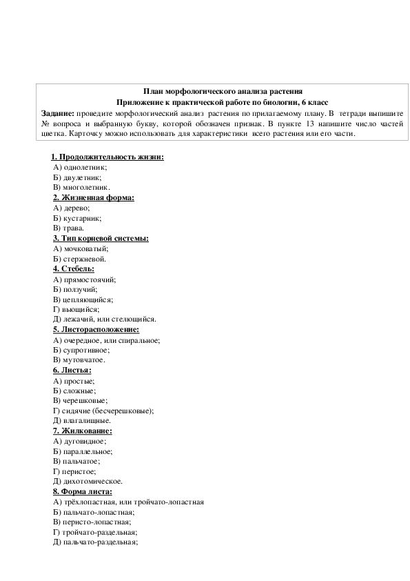 Задание: проведите морфологический анализ растения по прилагаемому плану. В тетради выпишите № вопроса и выбранную букву, которой обозначен признак. В пункте 13 напишите число частей цветка. Карточку можно использовать для характеристики всего растения или его части.план