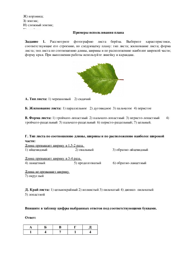Задание 1. Рассмотрите фотографию листа берёзы. Выберите характеристики,