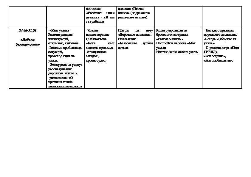 Перспективный план работы с детьми старшей группы в летний оздоровительный период 2014/2015 учебный год Данное планирование представляет собой план-сетку в соответствии с возрастными особенностями детей старшего дошкольного возраста. Представлен комплекс мероприятий по всем образовательным областям, основанный на игровой деятельности детей.