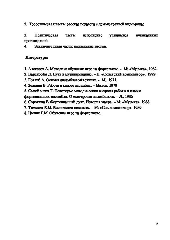 1. Алексеев А. Методика обучения игре на фортепиано. М: «Музыка», 1982.