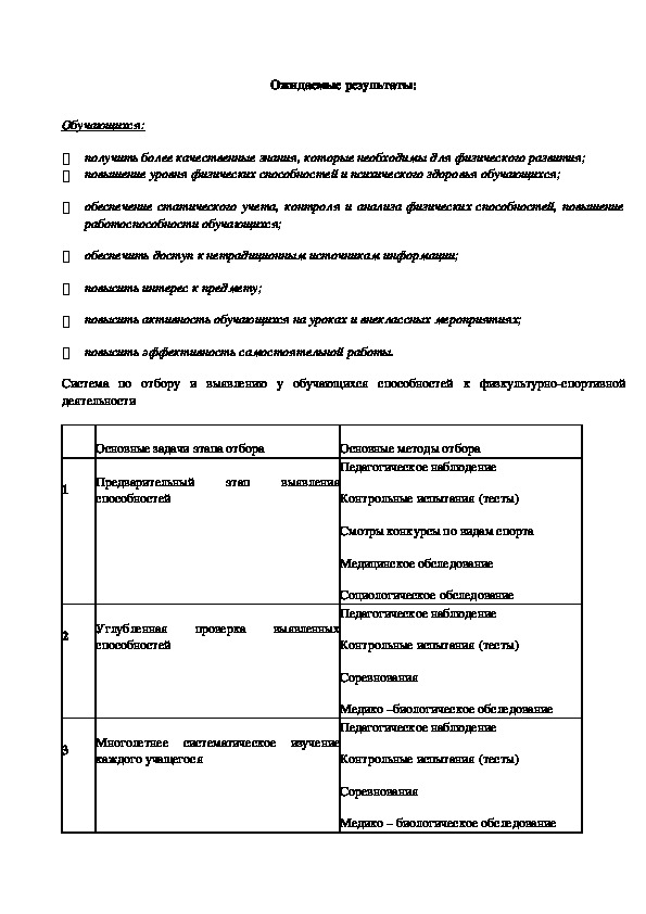 развернутый план работы по развитию физических способностей у обучающихся, содержит цели, задачи, ожидаемые результаты и систему по отбору и выявлению у обучающихся способностей к физкультурно-спортивной деятельности. На основе педагогических наблюдений определяются специфические способности учащихся. Так, например, учитель путем систематического наблюдения за учеником фиксирует его способности к освоению программы.