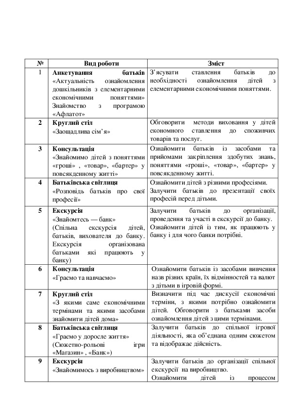 План роботи з батьками допоможуть залучити батьків до формування у дітей первинне економічне мислення, розвинути базові якості дошкільників, реалізуючи завдання Базового компонента дошкільної освіти, чинних програм та програми соціально-фінансової освіти «Афлатот».