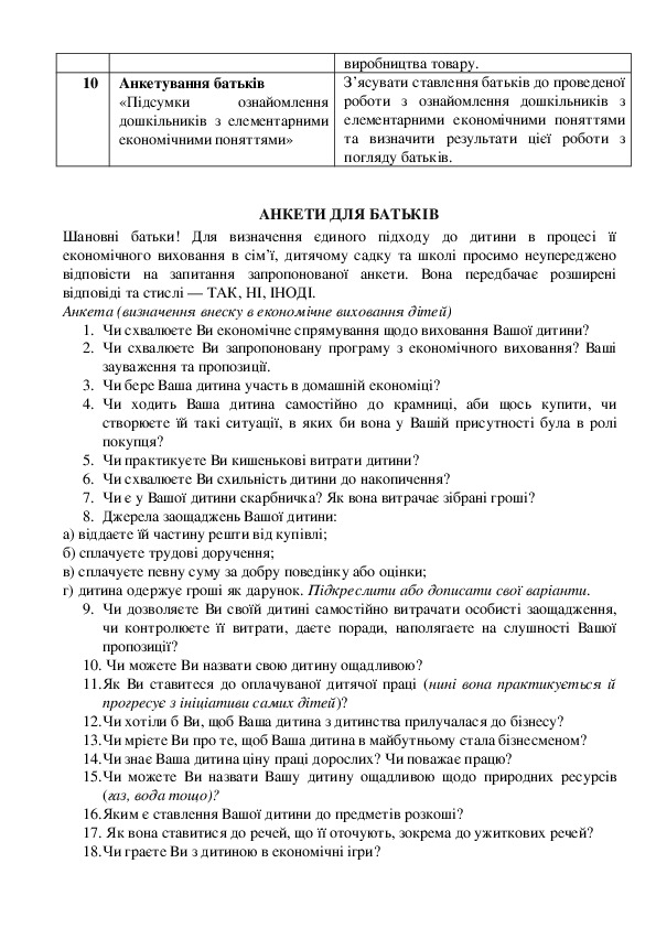 Рекомендовано для працівників дошкільних навчальних закладів, дітей та їх батьків активність дітей в процесі пізнання економічних основ, розвине в них інтерес до навколишнього світуПлан роботи з батьками допоможуть залучити батьків до формування у дітей первинне економічне мислення, розвинути базові якості дошкільників, реалізуючи завдання Базового компонента дошкільної освіти, чинних програм та програми соціально-фінансової освіти «Афлатот».