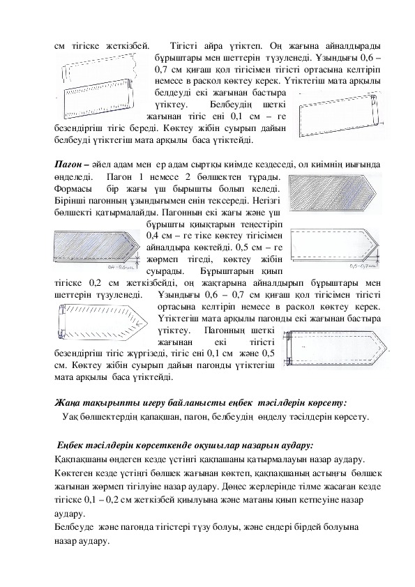 шеттерін түзуленеді. Ұзындығы 0,6 – 0,7 см қиғаш қол тігісімен тігісті