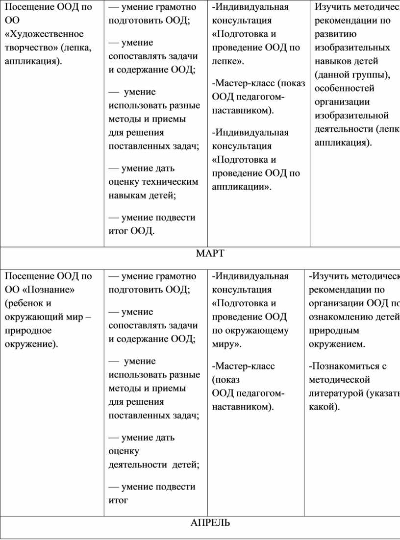-Индивидуальная консультация «Подготовка и проведение ООД по лепке». -Мастер-класс (показ ООД педагогом-наставником). -Индивидуальная консультация «Подготовка и проведение ООД по аппликации». |