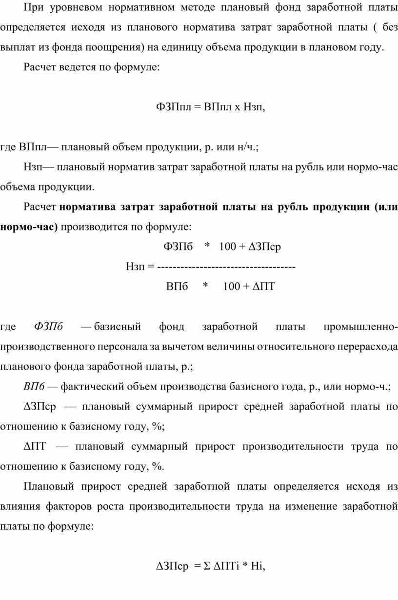 При уровневом нормативном методе плановый фонд заработной платы определяется исходя из планового норматива затрат заработной платы ( без выплат из фонда поощрения) на единицу объема продукции в плановом году.