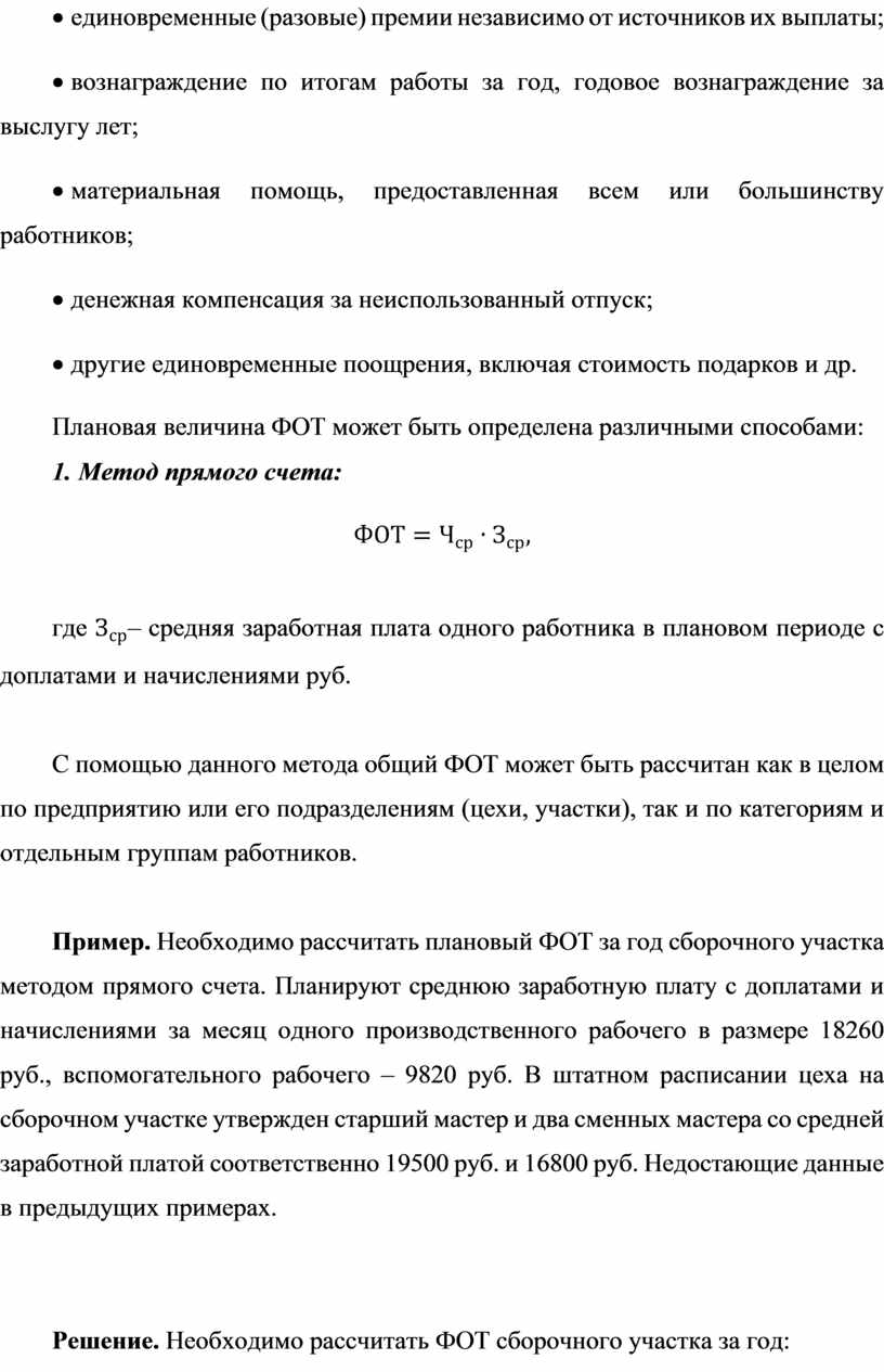 Пример. Необходимо рассчитать плановый ФОТ за год сборочного участка методом прямого счета. Планируют среднюю заработную плату с доплатами и начислениями за месяц одного производственного рабочего в размере 18260 руб., вспомогательного рабочего – 9820 руб. В штатном расписании цеха на сборочном участке утвержден старший мастер и два сменных мастера со средней заработной платой соответственно 19500 руб. и 16800 руб. Недостающие данные в предыдущих примерах.