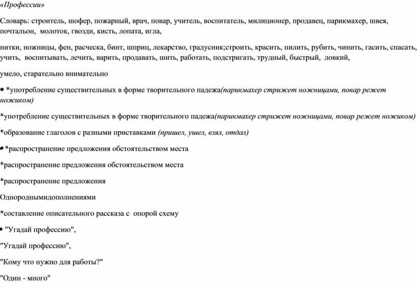 1.Совершенствование умения употреблять существительные в форме творительного падежа на материале темы «Профессии» 2. Развитие умения составлять рассказ с опорой на схему на материале темы «Профессии» Словарь: строитель, шофер, пожарный, врач, повар, учитель, воспитатель, милиционер, продавец, парикмахер, швея, почтальон, молоток, гвозди, кисть, лопата, игла, нитки, ножницы, фен, расческа, бинт, шприц, лекарство, градусник;строить, красить, пилить, рубить, чинить, гасить, спасать, учить, воспитывать, лечить, варить, продавать, шить, работать, подстригать, трудный, быстрый, ловкий, умело, старательно внимательно