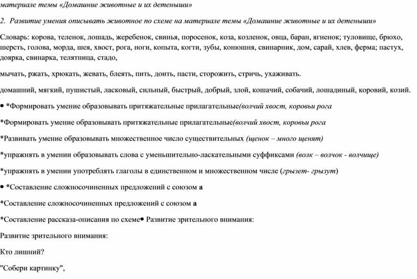 1.Развитие умения образовывать притяжательные прилагательные на материале темы «Домашние животные и их детеныши» 2. Развитие умения описывать животное по схеме на материале темы «Домашние животные и их детеныши» Словарь: корова, теленок, лошадь, жеребенок, свинья, поросенок, коза, козленок, овца, баран, ягненок; туловище, брюхо, шерсть, голова, морда, шея, хвост, рога, ноги, копыта, когти, зубы, конюшня, свинарник, дом, сарай, хлев, ферма; пастух, доярка, свинарка, телятница, стадо, мычать, ржать, хрюкать, жевать, блеять, пить, доить, пасти, сторожить, стричь, ухаживать. домашний, мягкий, пушистый, ласковый, сильный, быстрый, добрый, злой, кошачий, собачий, лошадиный, коровий, козий.