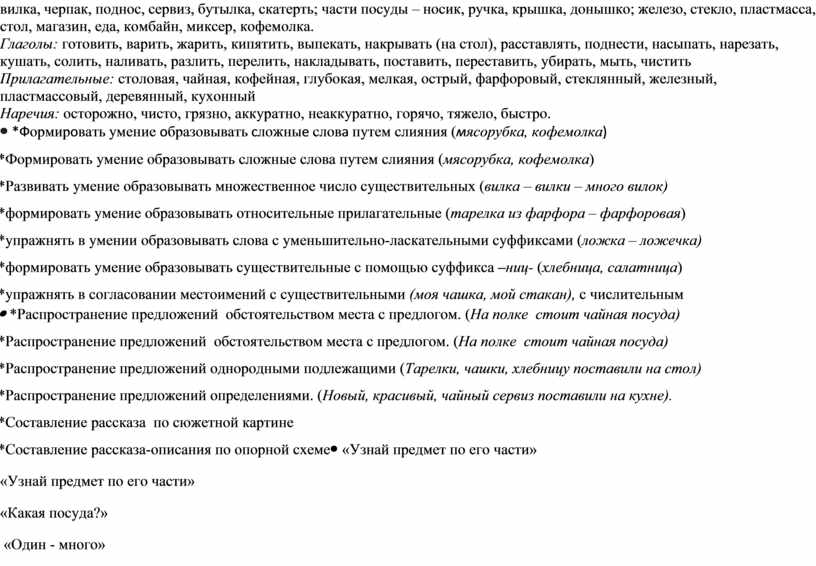 *Формировать умение образовывать сложные слова путем слияния (мясорубка, кофемолка) *Развивать умение образовывать множественное число существительных (вилка – вилки – много вилок) *формировать умение образовывать относительные прилагательные (тарелка из фарфора – фарфоровая) *упражнять в умении образовывать слова с уменьшительно-ласкательными суффиксами (ложка – ложечка) *формировать умение образовывать существительные с помощью суффикса –ниц- (хлебница, салатница) *упражнять в согласовании местоимений с существительными (моя чашка, мой стакан), с числительным |