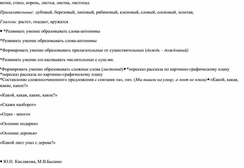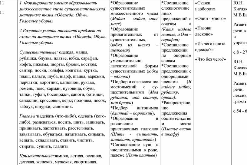 Ю.Н. Кислякова, М.В.Былино Развитие речи в играх и упражнениях с.2-11 Ю.Н. Кислякова, М.В.Былино Развитие речи: лексика и граматика, с.2-11 |