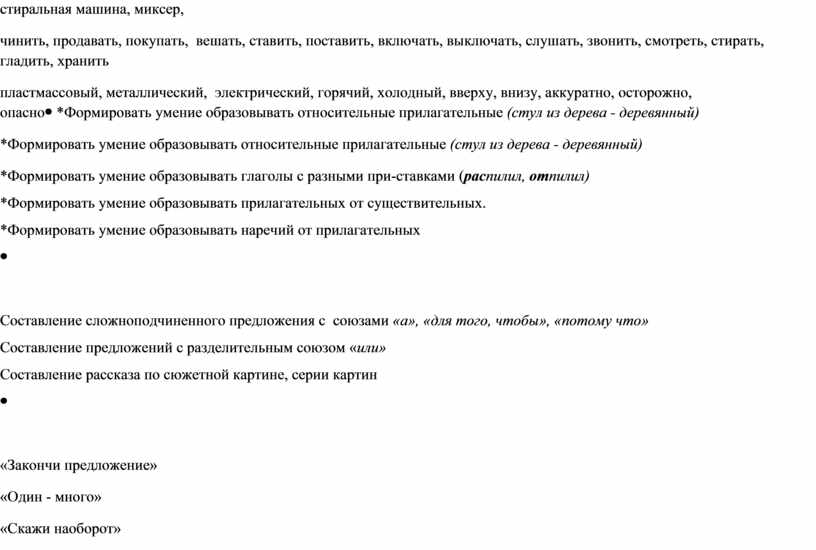 *развивать умение образовывать прилагательные от существительных *упражнять в умении образовывать глаголы с разными приставками (поставить, переставить) *развивать умение образовывать мн.ч. В.п., Р. п. существительных (колбаса-колбасы-колбас) |