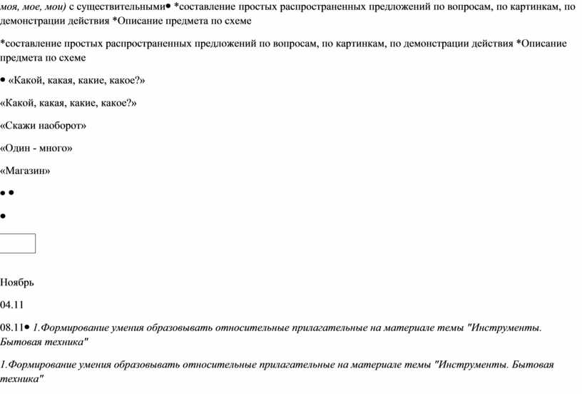 *составление простых распространенных предложений по вопросам, по картинкам, по демонстрации действия *Описание предмета по схеме