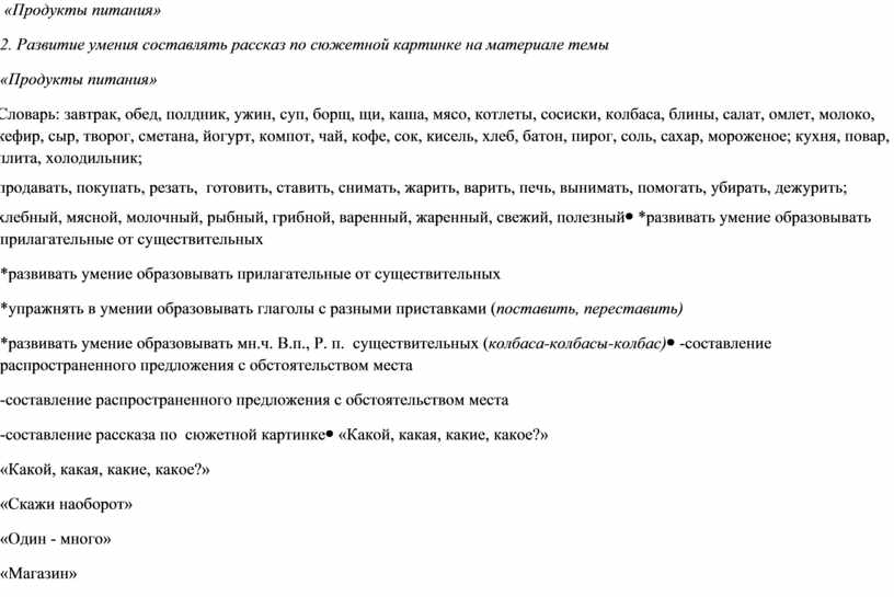 1. Развитие умения образовывать прилагательные от существительных на материале темы «Продукты питания» 2. Развитие умения составлять рассказ по сюжетной картинке на материале темы «Продукты питания» Словарь: завтрак, обед, полдник, ужин, суп, борщ, щи, каша, мясо, котлеты, сосиски, колбаса, блины, салат, омлет, молоко, кефир, сыр, творог, сметана, йогурт, компот, чай, кофе, сок, кисель, хлеб, батон, пирог, соль, сахар, мороженое; кухня, повар, плита, холодильник; продавать, покупать, резать, готовить, ставить, снимать, жарить, варить, печь, вынимать, помогать, убирать, дежурить; хлебный, мясной, молочный, рыбный, грибной, варенный, жаренный, свежий, полезный |