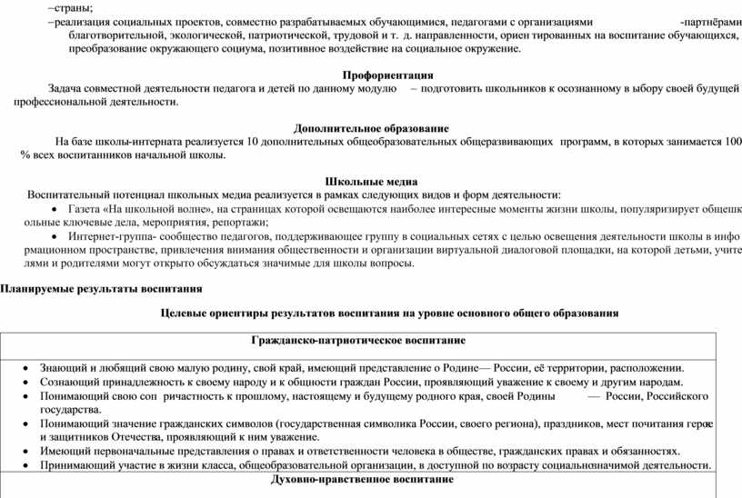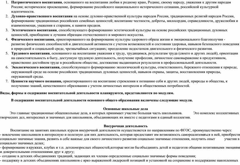 Воспитательная деятельность в основной школе планируется и осуществляется в соответствии с приоритетами государственной политики в сфере воспитания, установленными в Стратегии развития воспитания в Российской Федерации на период до 2025 года (Распоряжение Правительства Российской Федерации от 29.05.2015 № 996-р).