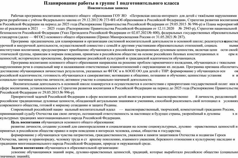 Рабочая программа воспитания основного общего образования ГОУ ЯО «Петровская школа-интернат» для детей с тяжёлыми нарушениями речи разработана с учётом Федерального закона от 29.12.2012 № 273-ФЗ «Об образовании в Российской Федерации», Стратегии развития воспитания в Российской Федерации на период до 2025 года (Распоряжение Правительства Российской Федерации от 29.05.2015 № 996-р) и Плана мероприятий по её реализации в 2021 — 2025 годах (Распоряжение Правительства Российской Федерации от 12.11.2020 № 2945-р), Стратегии национальной безопасности Российской Федерации (Указ Президента Российской Федерации от 02.07.2021 № 400), федеральных государственных образовательных стандартов (далее — ФГОС) основного общего образования (Приказ Минпросвещения России от 31.05.2021 № 287).