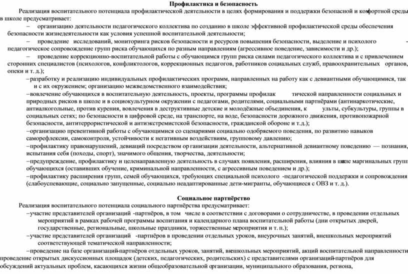 - вовлечение обучающихся в воспитательную деятельность, проекты, программы профилактической направленности социальных и природных рисков в школе и в социокультурном окружении с педагогами, родителями, социальными партнёрами (антинаркотические, антиалкогольные, против курения, вовлечения в деструктивные детские и молодёжные объединения, культы, субкультуры, группы в социальных сетях; по безопасности в цифровой среде, на транспорте, на воде, безопасности дорожного движения, противопожарной безопасности, антитеррористической и антиэкстремистской безопасности, гражданской обороне и т. д.);