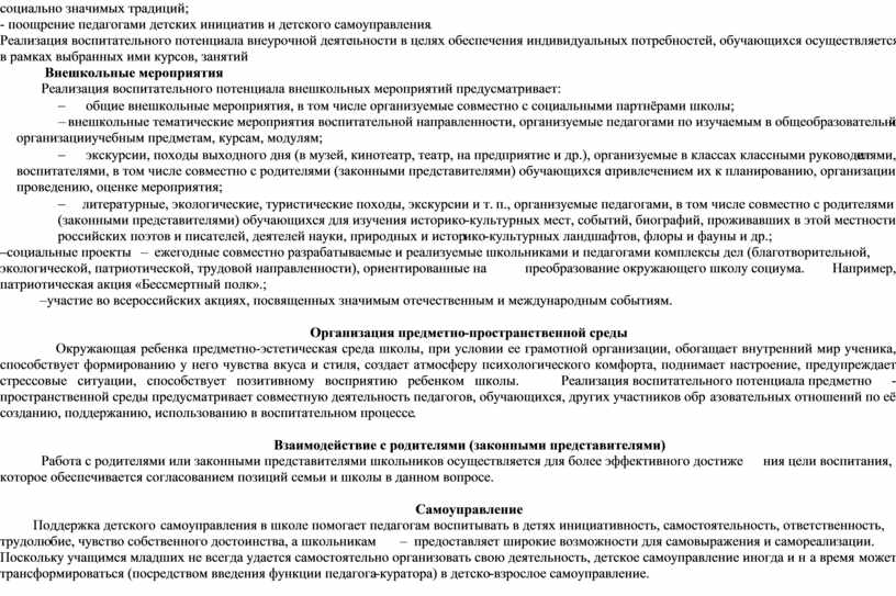 Окружающая ребенка предметно-эстетическая среда школы, при условии ее грамотной организации, обогащает внутренний мир ученика, способствует формированию у него чувства вкуса и стиля, создает атмосферу психологического комфорта, поднимает настроение, предупреждает стрессовые ситуации, способствует позитивному восприятию ребенком школы. Реализация воспитательного потенциала предметно-пространственной среды предусматривает совместную деятельность педагогов, обучающихся, других участников образовательных отношений по её созданию, поддержанию, использованию в воспитательном процессе.