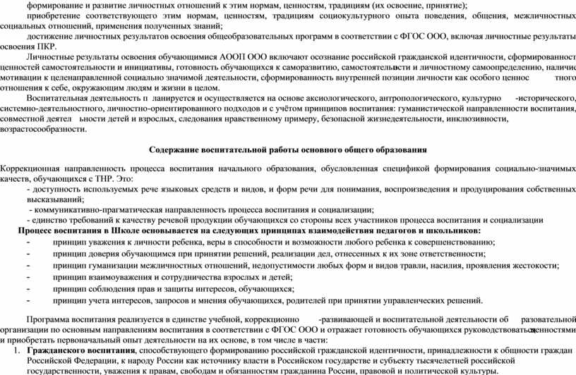 Программа воспитания реализуется в единстве учебной, коррекционно-развивающей и воспитательной деятельности образовательной организации по основным направлениям воспитания в соответствии с ФГОС ООО и отражает готовность обучающихся руководствоваться ценностями и приобретать первоначальный опыт деятельности на их основе, в том числе в части: